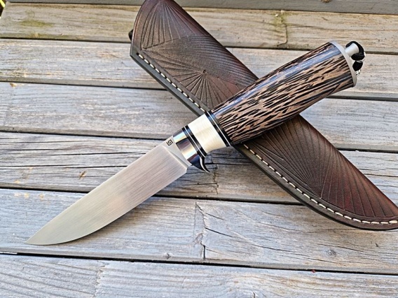 Oprawa noża składa się z wielu elementów - od gardy ze stali nierdzewnej, poprzez przekładki z G10 i stali nierdzewnej aż po uchwyt z imitacj kości słoniowej i czarnej palmy. Całość tworzy harmonijną kompozycję estetyczną, która doskonale współgra z praktycznym zastosowaniem tego narzędzia.